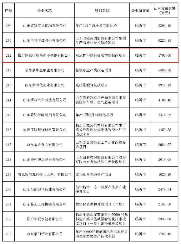 據(jù)名單信息顯示,臨沂鋼鐵投資集團(tuán)不銹鋼有限公司短流程不銹鋼提質(zhì)增效技改項(xiàng)目獲獎(jiǎng)補(bǔ)資金1703.06萬(wàn)元。